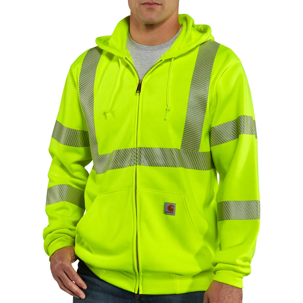 The bright and rugged Carhartt Class 3 Sweatshirt is built for warmth and easy care in 100% Polyester fabric with a stain-release finish. When conditions turn cold, pull up the hood with its adjustable drawcord closure, zip up tight, and keep your hands warm in the two front pockets. You'll stand out in the right way with 3M Scotchlite reflective trim in a sweatshirt that keeps its form wash after wash. The stretchable, spandex-reinforced rib-knit cuffs and waistband also work to seal in body warmth making this a great high-vis, cold weather choice.